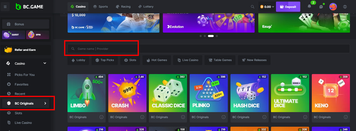 3. Find game types. Go to the part on “BC Originals,” where the Crash TrendBall game is mentioned.