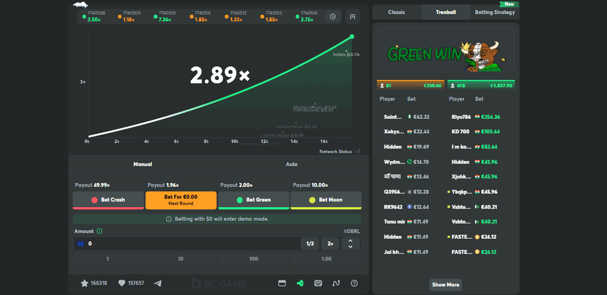Special FeaturesTrenball mode allows betting on predicted multiplier ranges (Red, Green, Moon)