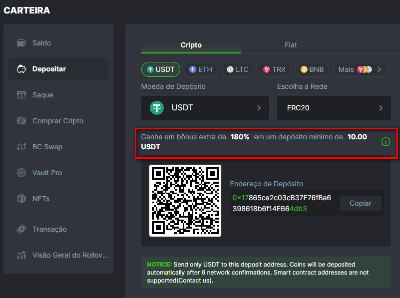 4. Make a deposit. BC.Game will issue an address that is uniquely generated based on what type of deposit is being made. If you are on your desktop, paste that address into your crypto wallet under “recipient”. If you are doing this with a mobile device, scan the QR code with your Wallet App so that the deposit address auto-populates.