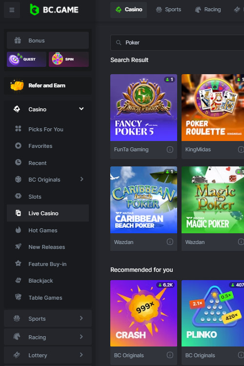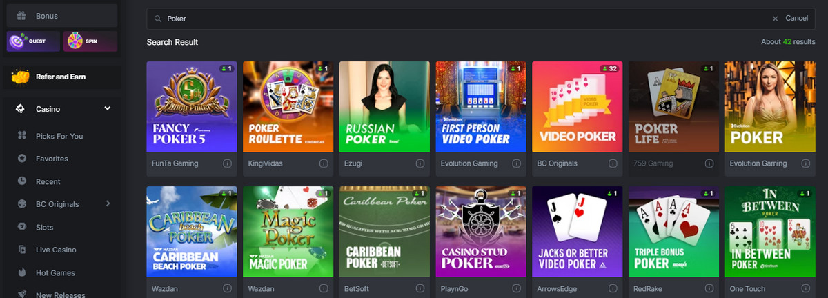 Poker is also very popular in the world, which is why more than 10 variations of the game at BC.Game live casino. You can find them in the Casino section by selecting Poker.