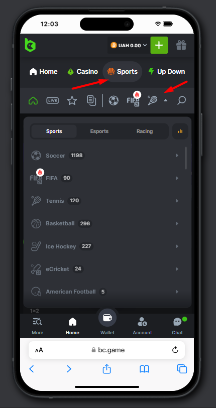 - Locate the “Sports” pane for betting after logging in. Tennis on the site BC.Game is found under the pane “Sports.”