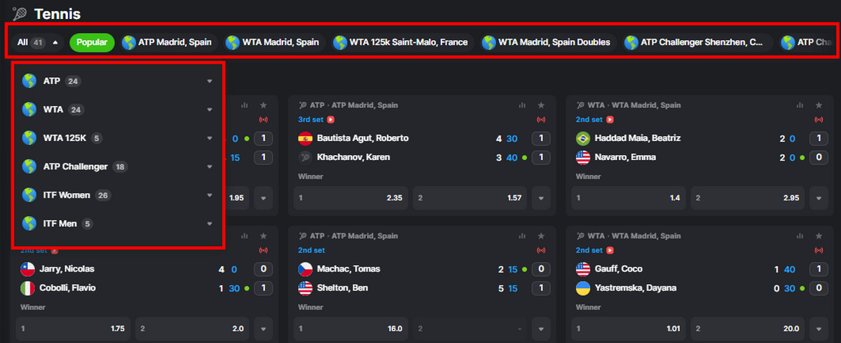 - ATP Madrid, Spain. Level: ATP Masters 1000. One of the key clay court tournaments in the ATP circuit, played by high-ranked players. High-profile matches provide numerous betting options and usually attract heavy betting volume.