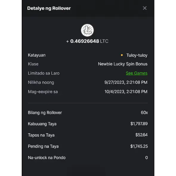 - Mga takda sa withdrawal . Upang ma-withdraw ang anumang mga panalo na naipon mula sa Lucky Wheel, ang mga manlalaro ay kinakailangang matugunan ang kondisyon sa pagtaya na itinakda sa 60 beses ang halagang napanalunan sa pamamagitan ng spin. Ang mga detalye tungkol sa mga karapat-dapat na laro at ang pag-usad patungo sa pagtugon sa kinakailangang ito ay makikita sa Pahina ng Pangkalahatang-ideya ng Rollover.
